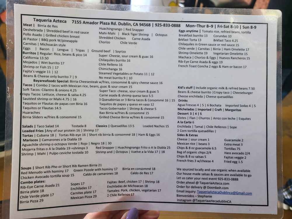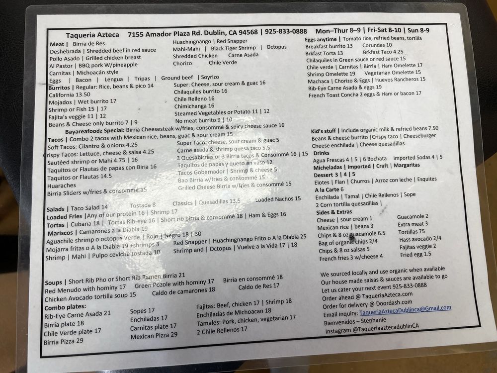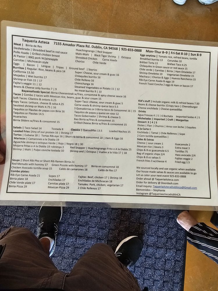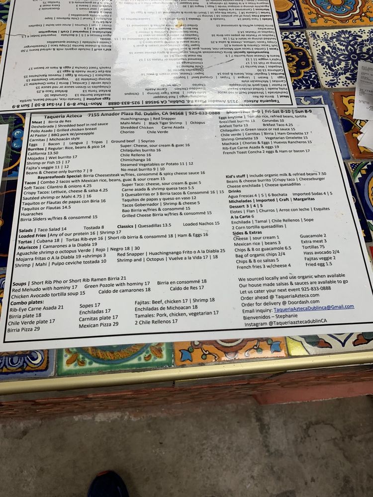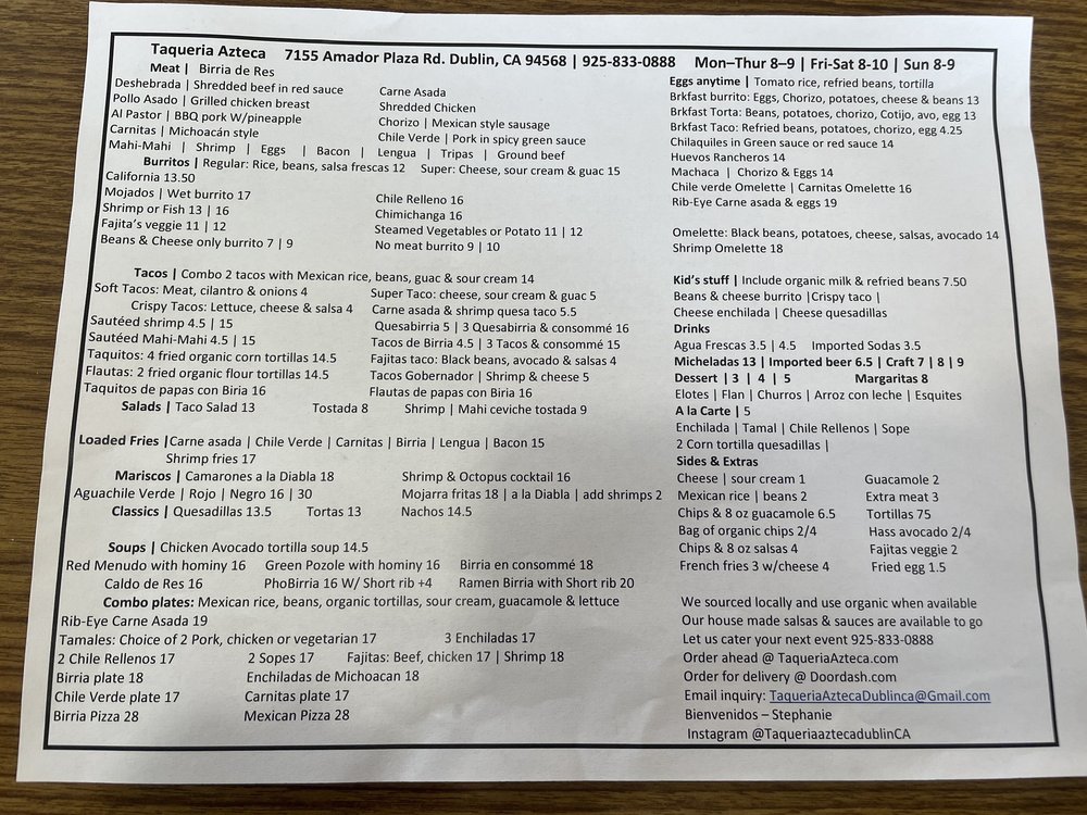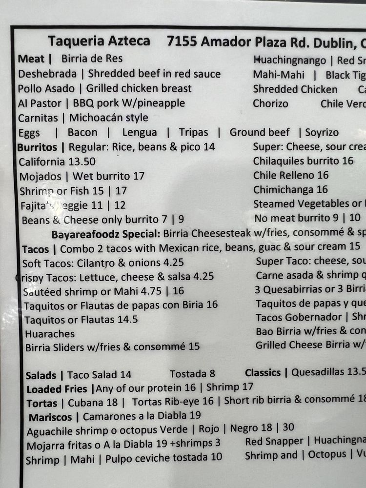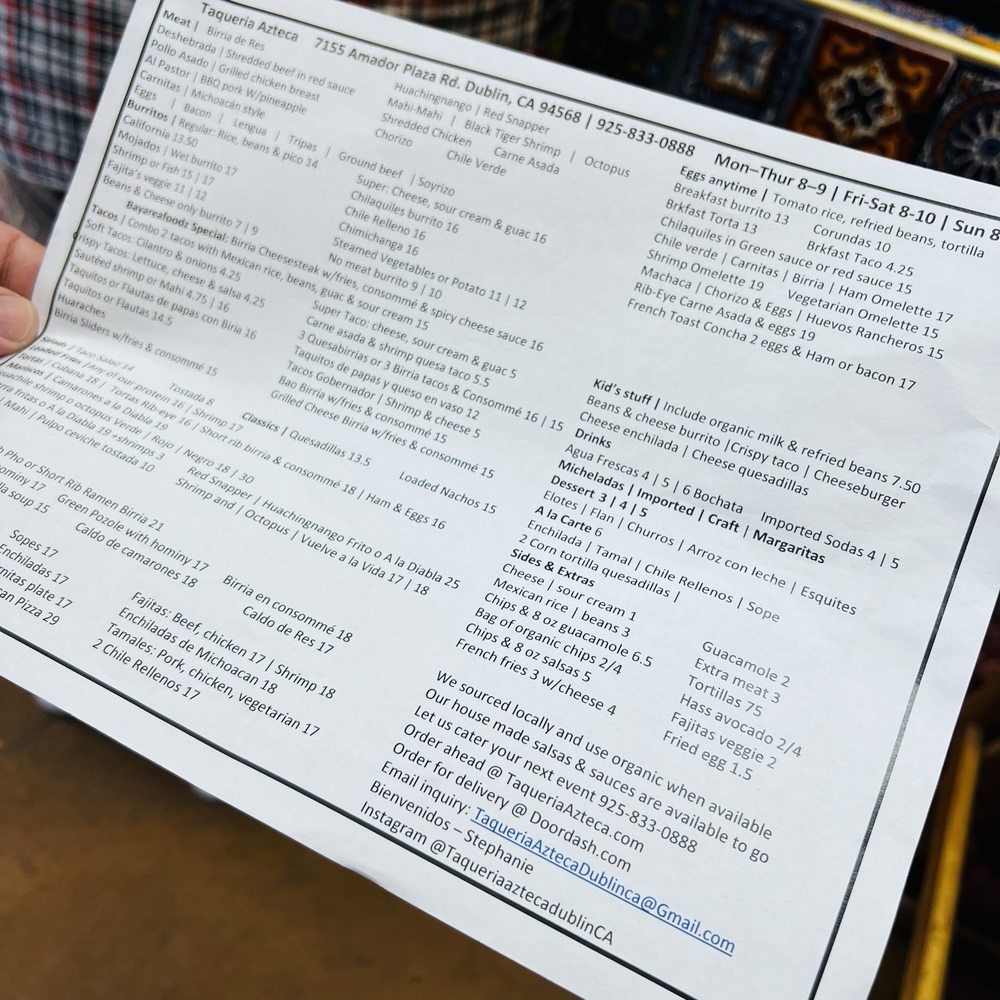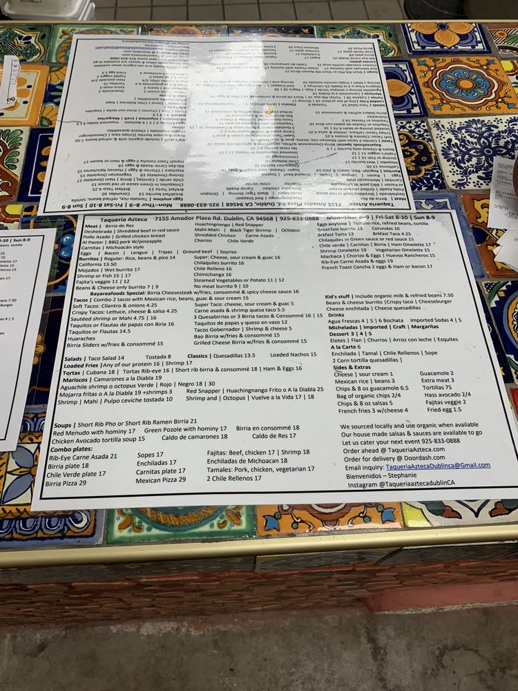 Taqueria Azteca is a casual dining spot in Dublin, CA, offering a range of Mexican delights. The menu features savory options like Breakfast Burritos, flavorful Tacos with organic corn tortillas, and wet-style Mojados Burritos. Customers rave about the traditional flavors and generous portions, with options for all tastes, including vegetarian choices. Those seeking an authentic taco experience will be delighted by the selection of meats like lengua and tripa. The inviting atmosphere, ample parking, and friendly service make it a top choice for lunch or dinner. With standout dishes like the taco salad and shrimp tacos, coupled with affordable prices, Taqueria Azteca promises a satisfying and enjoyable dining experience every time.